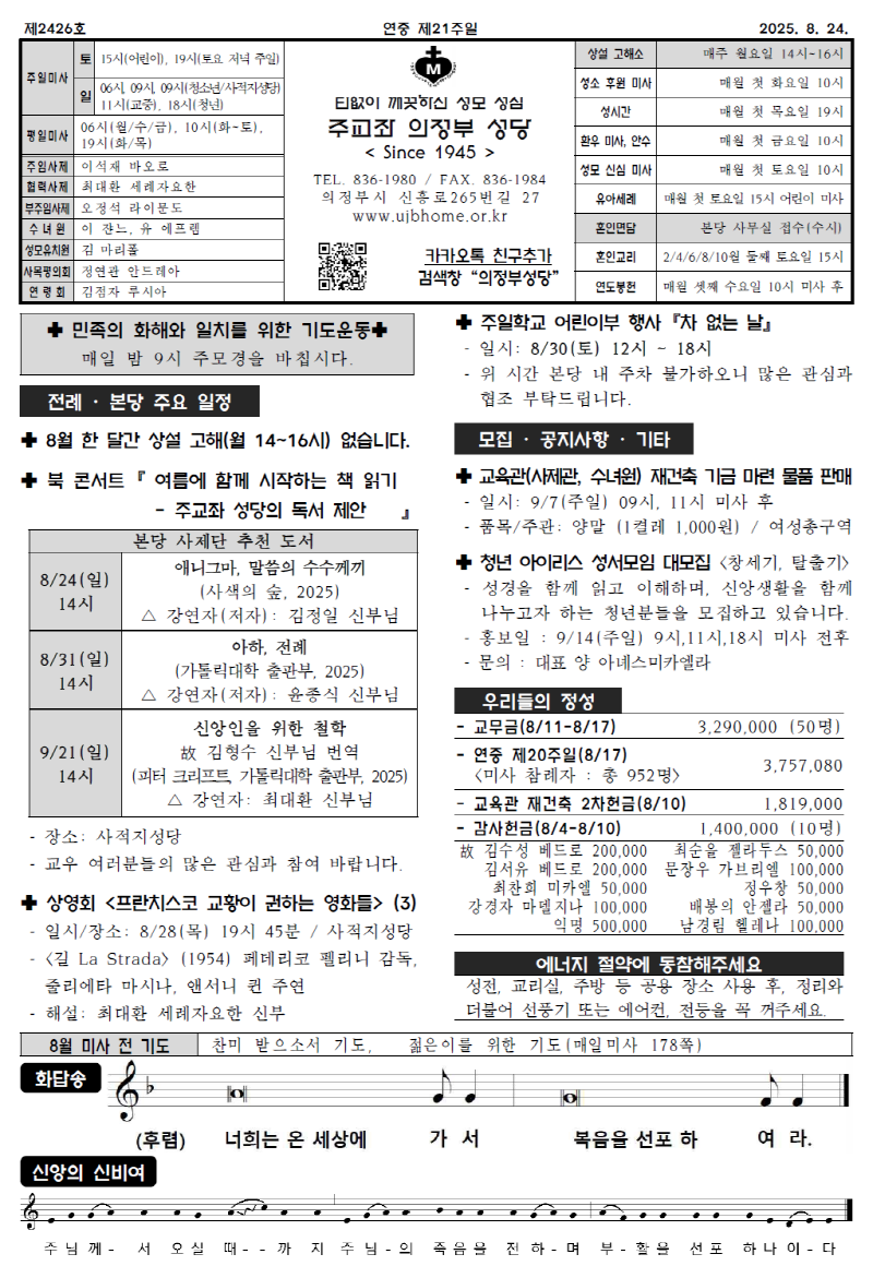 본당 주보 2025년 8월 24일 연중 제21주일 작성자 ujbhome 작성일 2025-08-20 12:00 조회 520 2025년 8월 24일 연중 제21주일 주보 본당면입니다. 단체/개별 연락처는 온라인에서는 제공하지 않습니다. 실물 주보 참고하시기 바랍니다. 좋아요 0 싫어요 0 인쇄 « 2025년 8월 17일 연중 제20주일 2025년 8월 31일 연중 제22주일 » 목록보기 답글쓰기 Powered by KBoard