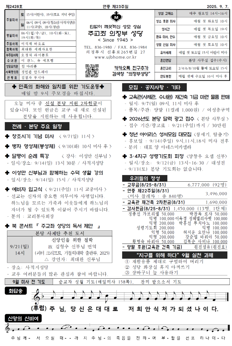 본당 주보 2025년 9월 7일 연중 제23주일 작성자 ujbhome 작성일 2025-09-03 13:41 조회 429 2025년 9월 7일 연중 제22주일 주보 본당면입니다. 단체/개별 연락처는 온라인에서는 제공하지 않습니다. 실물 주보 참고하시기 바랍니다. 좋아요 2 싫어요 0 인쇄 « 2025년 8월 31일 연중 제22주일 2025년 9월 14일 성 십자가 현양 축일 » 목록보기 답글쓰기 Powered by KBoard