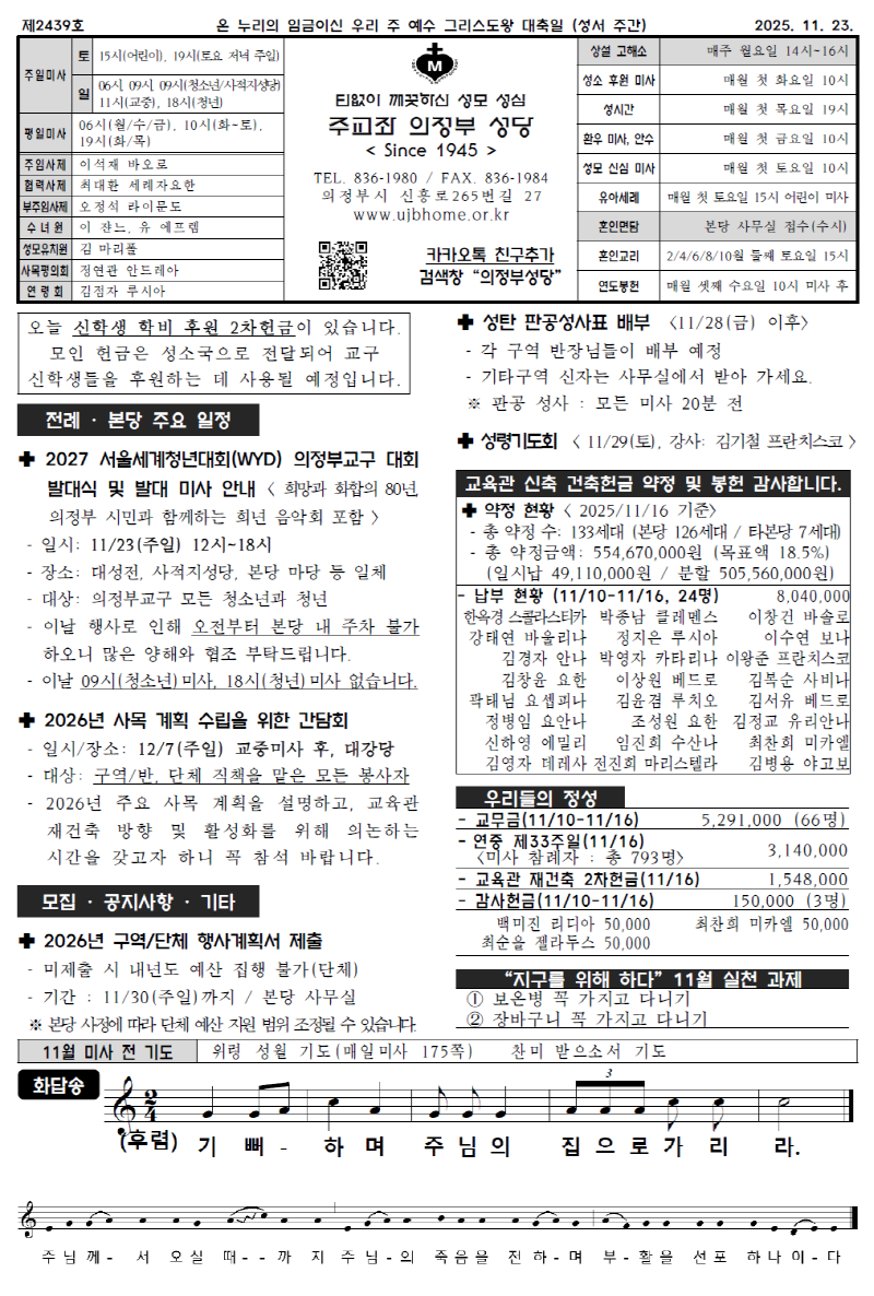 본당 주보 2025년 11월 23일 온 누리의 임금이신 우리 주 예수 그리스도왕 대축일 작성자 ujbhome 작성일 2025-11-19 14:48 조회 351 2025년 11월 23일 온 누리의 임금이신 우리 주 예수 그리스도왕 대축일 주보 본당면입니다. 단체/개별 연락처는 온라인에서는 제공하지 않습니다. 실물 주보 참고하시기 바랍니다. 좋아요 0 싫어요 0 인쇄 « 2025년 11월 16일 연중 제33주일 (세계 가난한 이의 날) 2025년 11월 30일 대림 제1주일 » 목록보기 답글쓰기 Powered by KBoard