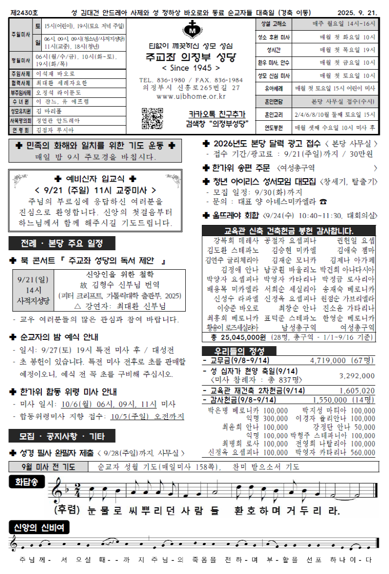 본당 주보 2025년 9월 21일 성 김대건 안드레아 사제와 성 정하상 바오로와 동료 순교자들 대축일 (경축 이동) 작성자 ujbhome 작성일 2025-09-17 14:46 조회 429 2025년 9월 21일 성 김대건 안드레아 사제와 성 정하상 바오로와 동료 순교자들 대축일 (경축 이동) 단체/개별 연락처는 온라인에서는 제공하지 않습니다. 실물 주보 참고하시기 바랍니다. 좋아요 0 싫어요 0 인쇄 « 2025년 9월 14일 성 십자가 현양 축일 2025년 9월 28일 연중 제26주일 » 목록보기 답글쓰기 Powered by KBoard