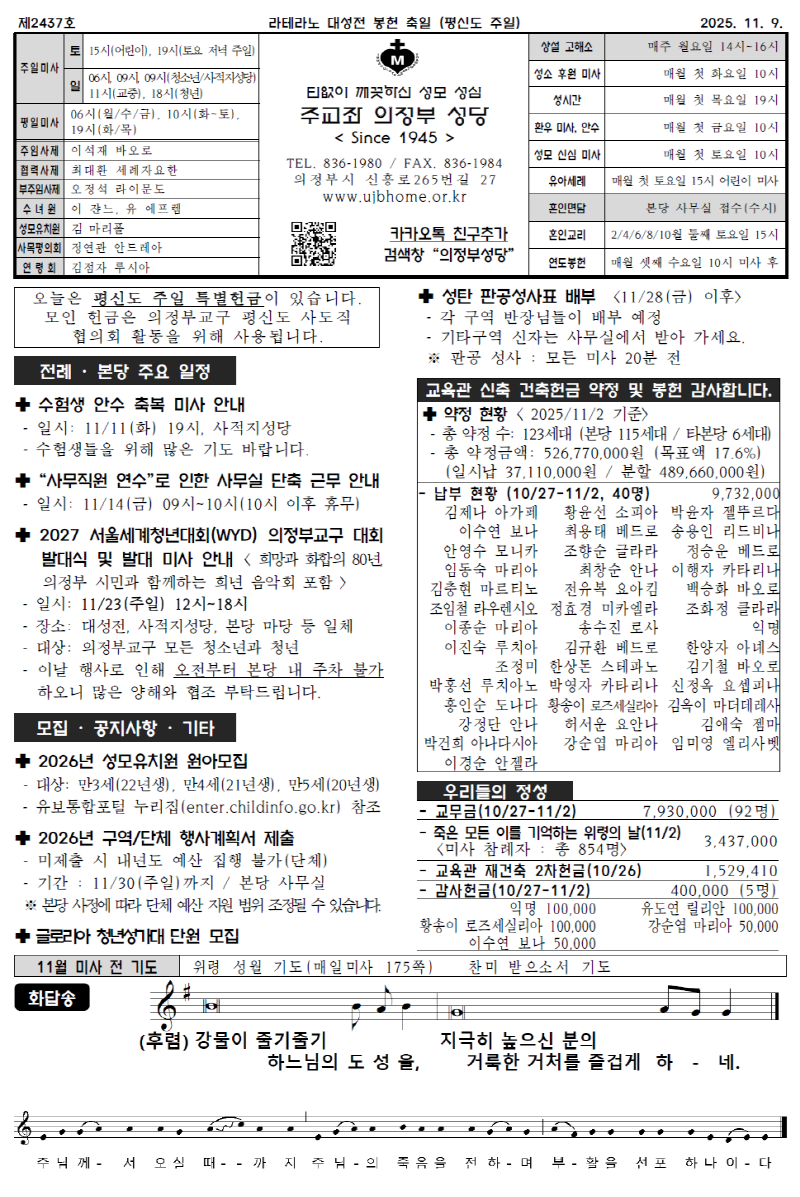 본당 주보 2025년 11월 9일 라테라노 대성전 봉헌 축일 (평신도 주일) 작성자 ujbhome 작성일 2025-11-05 13:28 조회 276 2025년 11월 9일 라테라노 대성전 봉헌 축일 (평신도 주일) 주보 본당면입니다. 단체/개별 연락처는 온라인에서는 제공하지 않습니다. 실물 주보 참고하시기 바랍니다. 좋아요 0 싫어요 0 인쇄 « 2025년 11월 2일 죽은 모든 이를 기억하는 위령의 날 2025년 11월 16일 연중 제33주일 (세계 가난한 이의 날) » 목록보기 답글쓰기 Powered by KBoard