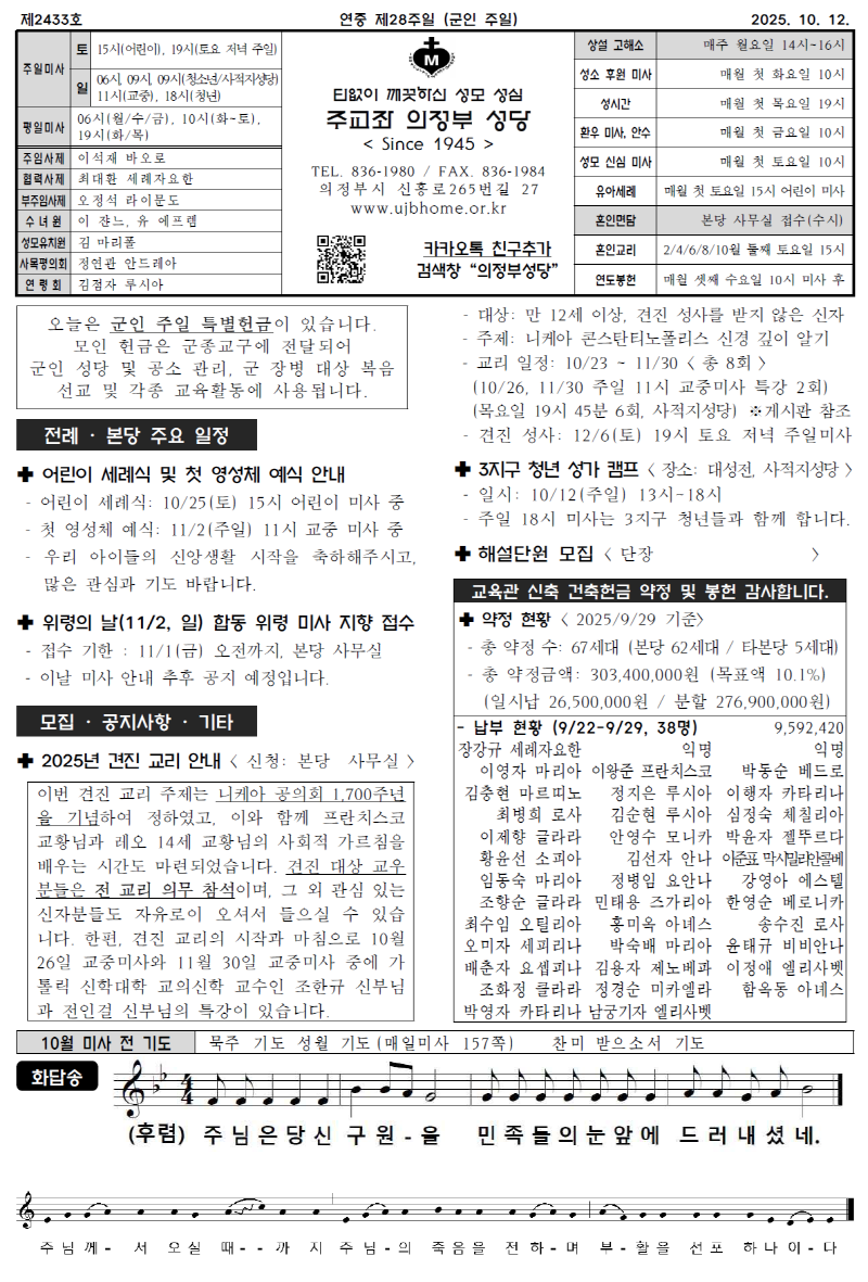 본당 주보 2025년 10월 12일 연중 제28주일, 군인 주일 작성자 ujbhome 작성일 2025-10-10 10:35 조회 304 2025년 10월 12일 연중 제28주일, 군인 주일 단체/개별 연락처는 온라인에서는 제공하지 않습니다. 실물 주보 참고하시기 바랍니다. 좋아요 0 싫어요 0 인쇄 « 2025년 10월 5일 연중 제27주일 2025년 10월 19일 연중 제29주일, 전교 주일 » 목록보기 답글쓰기 Powered by KBoard