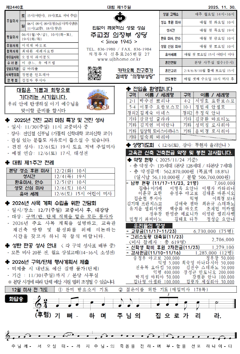 본당 주보 2025년 11월 30일 대림 제1주일 작성자 ujbhome 작성일 2025-11-26 16:35 조회 226 2025년 11월 30일 대림 제1주일 주보 본당면입니다. 단체/개별 연락처는 온라인에서는 제공하지 않습니다. 실물 주보 참고하시기 바랍니다. 좋아요 0 싫어요 0 인쇄 « 2025년 11월 23일 온 누리의 임금이신 우리 주 예수 그리스도왕 대축일 2025년 12월 7일 대림 제2주일 » 목록보기 답글쓰기 Powered by KBoard