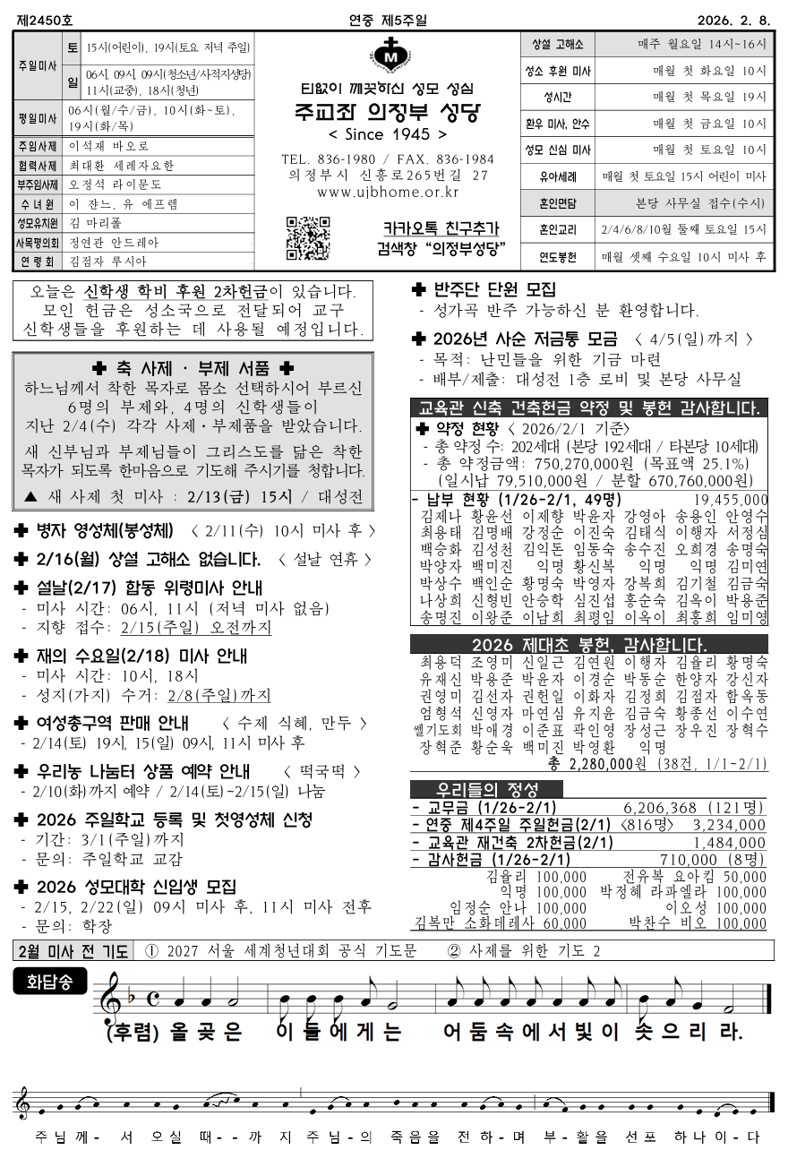 본당 주보 2026년 2월 8일 연중 제5주일 작성자 ujbhome 작성일 2026-02-05 09:24 조회 90 2026년 2월 8일 연중 제5주일 주보 본당면입니다. 단체/개별 연락처는 온라인에서는 제공하지 않습니다. 실물 주보 참고하시기 바랍니다. 좋아요 0 싫어요 0 인쇄 « 2026년 2월 1일 연중 제4주일 목록보기 답글쓰기 Powered by KBoard
